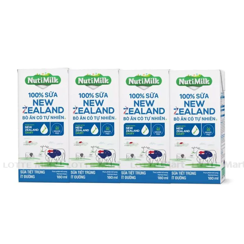 Sữa Tươi Tiệt Trùng Nutimilk 100% New Zealand Ít Đường Lốc 4 Hộp 180ml