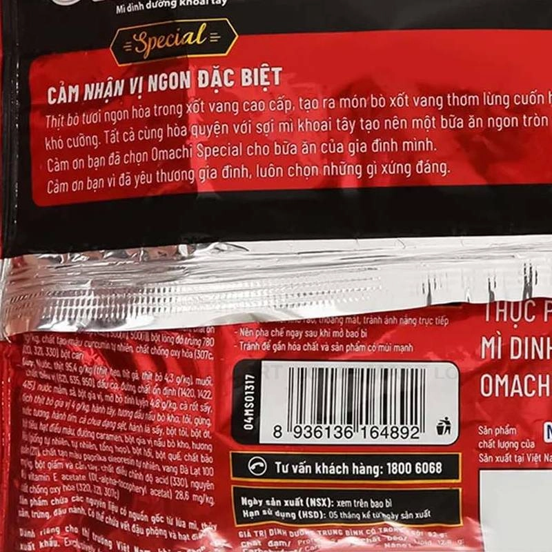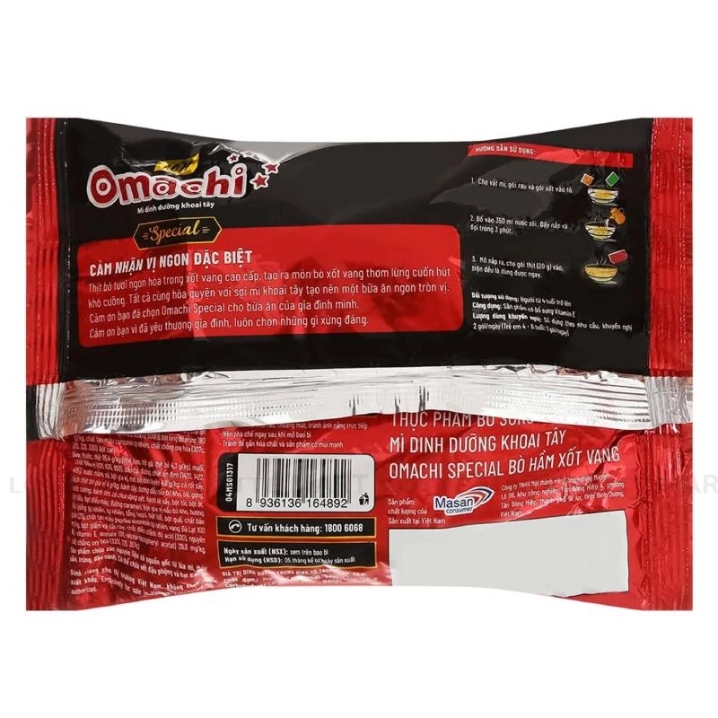 - Mì Omachi Special Xốt Bò Hầm với sợi mỳ mềm và dai, được làm từ khoai tây tươi chọn lọc, kết hợp với nước xốt được chế biến từ thịt bò bằm và cà chua tươi làm nên mì Omachi xốt bò hầm mang hương vị đặc trưng thơm ngon khó chối từ. Hương vị bò cùng gia vị hấp dẫn hòa quyện với nước sốt đậm đà, sẽ mang đến cho bạn mì Omachi bò hầm tuyệt hảo.