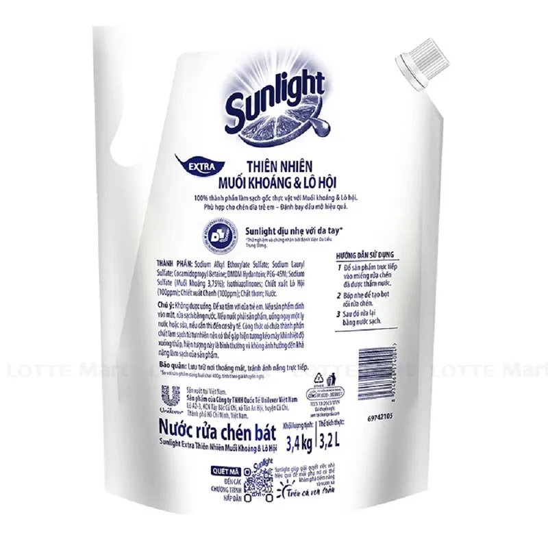 Nước Rửa Chén Sunlight Thiên Nhiên Chiết Xuất Muối Khoáng và Lô Hội Túi 3.4kg