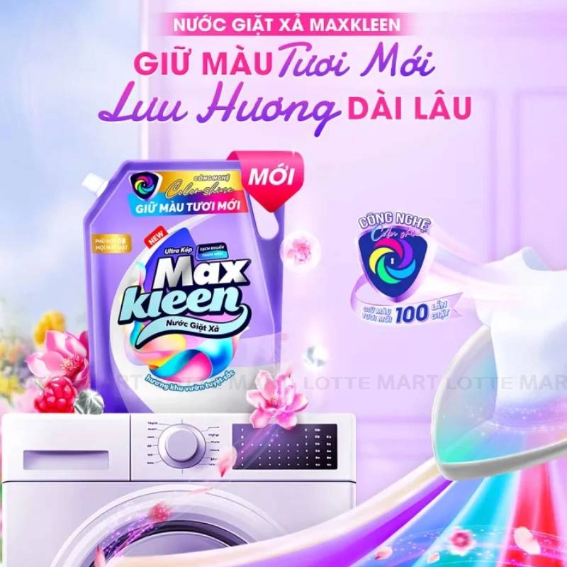 Nước Giặt Xả Maxkleen Giữ Màu Tươi Mới Hương Khu Vườn Tuyệt Sắc Cho Máy Giặt Cửa Trước Và Cửa Trên với công nghệ Color Shine giúp quần áo bền màu, luôn như mới.