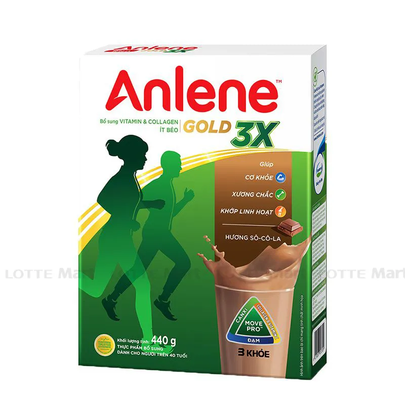 - Sữa Bột Anlene Gold 3X Hương Socola là dòng sản phẩm dinh dưỡng được thiết kế với công thức MovePro™, kết hợp nhiều dưỡng chất quan trọng giúp chăm sóc hệ cơ - xương - khớp khi bước vào độ tuổi từ 40 trở lên.