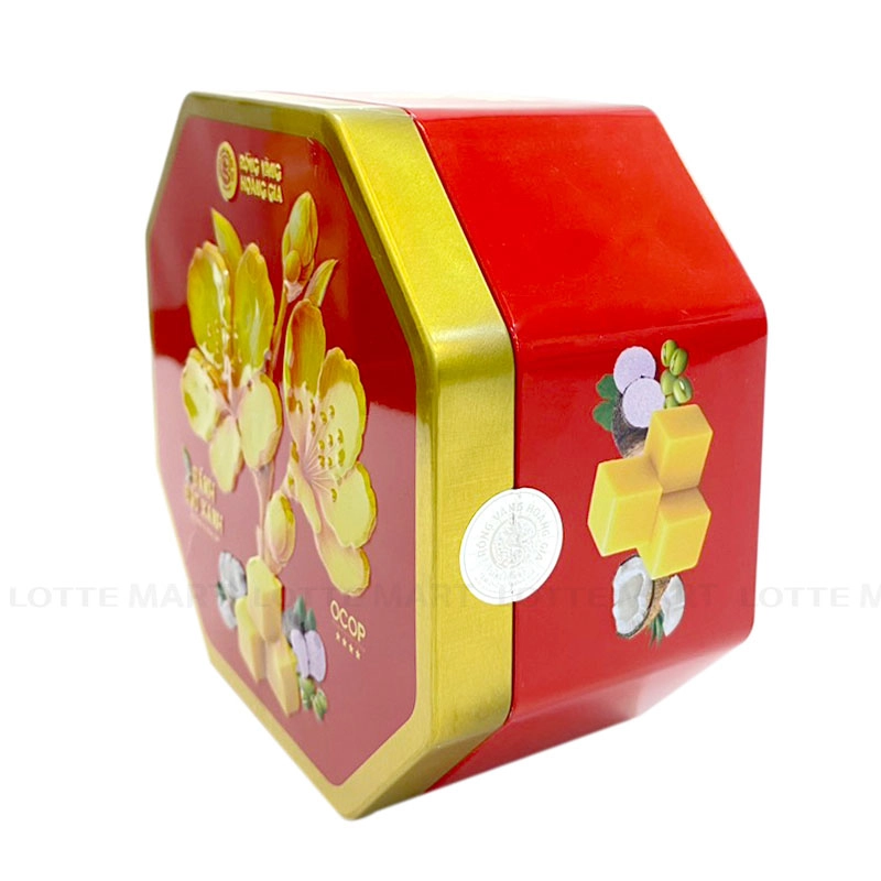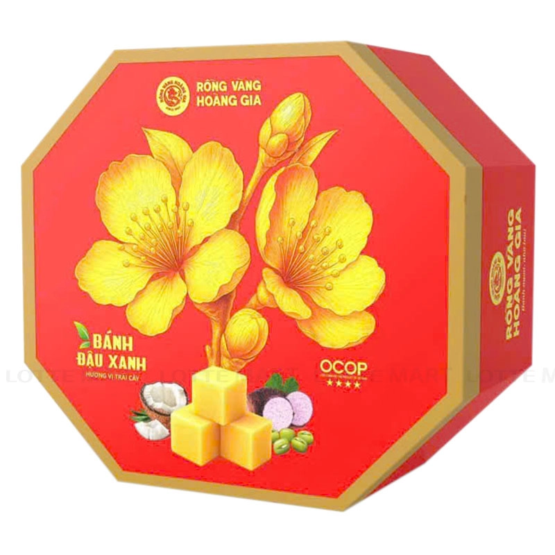 Bánh Đậu Xanh Rồng Vàng Hoàng Gia Hoa Anh Đào với thiết kế hộp thiếc bát giác đỏ rực rỡ, điểm xuyết hoa mai vàng mang đậm không khí Tết may mắn.