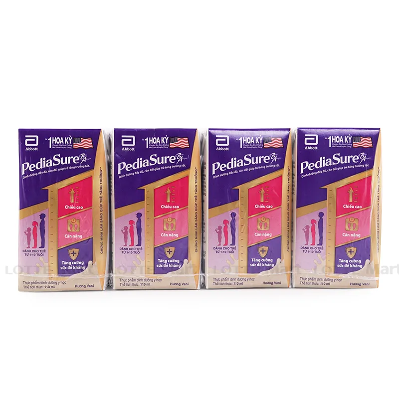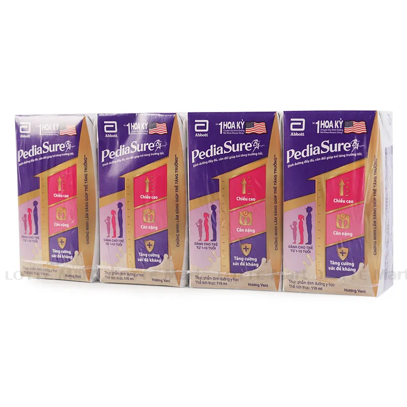Nhận được nhiều sự quan tâm vì độ tiện lợi, thơm ngon và nhiều dưỡng chất, Sữa Nước Pediasure Vị Vani Lốc 4 Hộp x 110ml được các chuyên gia dinh dưỡng của Hoa Kỳ khuyên dùng, sữa pha sẵn cho bé với hệ dưỡng chất Triple Sure tiên tiến giúp trẻ tăng chiều cao, cân nặng và sức đề kháng. Lốc 4 hộp sữa bột pha sẵn Abbott PediaSure vani 110ml hương vani thơm ngon, dễ uống.