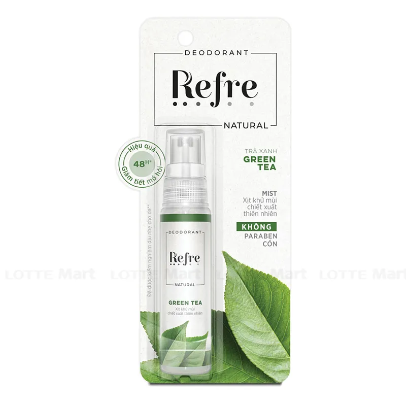 - Sản phẩm được chiết xuất từ các thành phần thiên nhiên lành tính hương trà xanh có khả năng khử mùi hiệu quả cho bạn thêm phần tự tin thể hiện phong cách riêng của chính mình. Refre Natural Deodorant Mist chứa các hạt phấn siêu nhỏ, cực mịn sẽ giúp hút ẩm một cách nhanh chóng đồng thời hỗ trợ se nhỏ lỗ chân lông, giữ cho vùng da dưới cánh tay bạn luôn khô thoáng, sáng mịn suốt cả ngày dài.