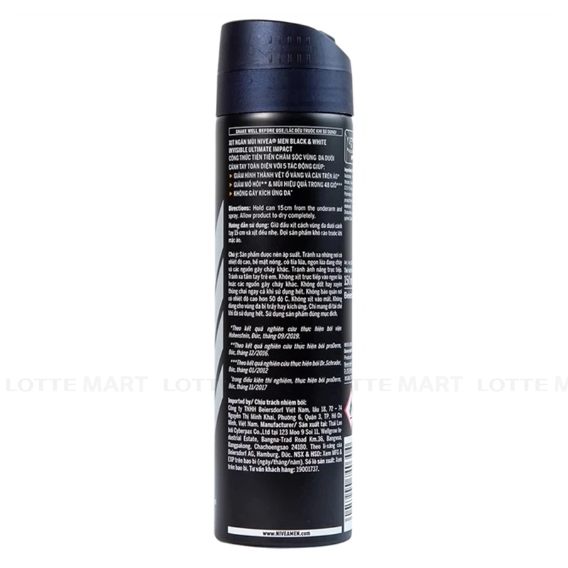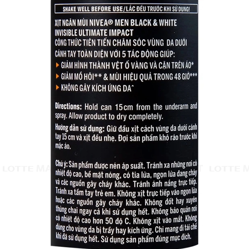 Xịt Ngăn Mùi Nivea Men Invisible For Black & White Ngăn Vệt Ố Vàng Chai 150ml với công thức độc quyền giúp giảm tiết mồ hôi và ngăn mùi hiệu quả lên đến 48 giờ, đồng thời giúp giảm hình thành vệt ố vàng trên áo so với các sản phẩm khử mùi thông thường. Sản phẩm đã được kiểm nghiệm da liễu, không bổ sung cồn, chất tạo màu, chất bảo quản, an toàn cho làn da nhạy cảm.