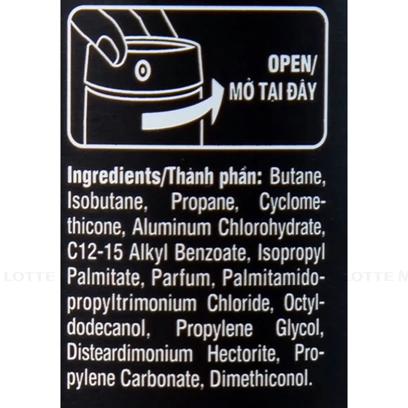 - Butane, Isobutane, Propane, Cyclomethicone, Aluminum Chlorohydrate, Isopropyl Palmitate, C12-15 Alkyl Benzoate, Palmitamidopropyltrimonium Chloride, Octyldodecanol, Propylene Glycol, Disteardimonium Hectorite, Propylene Carbonate, Dimethiconol, Parfum. sản phẩm không chứa cồn (Ethyl Alcohol).