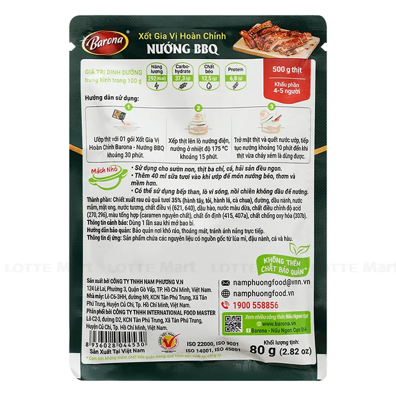 Xốt Gia Vị Hoàn Chỉnh Thịt Nướng BBQ Barona Gói 80G là công thức phối trộn độc đáo giữa chiết xuất rau củ quả tươi như: Hành tây, tỏi, hành lá, cà chua… cùng các loại gia vị truyền thống và thành phần mật ong nguyên chất được chọn lọc.
