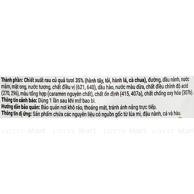 - Chiết xuất rau củ quả tươi 35% (hành tây, tỏi, hành lá, cà chua), đường, dầu nành, nước mắm, mật ong, nước tương, chất điều vị (621, 640), dầu hào, nước màu dừa, chất điều chỉnh độ acid (270, 296), màu tổng hợp (caramen nguyên chất), chất ổn định (415, 407a), chất chống oxy hóa (307b).