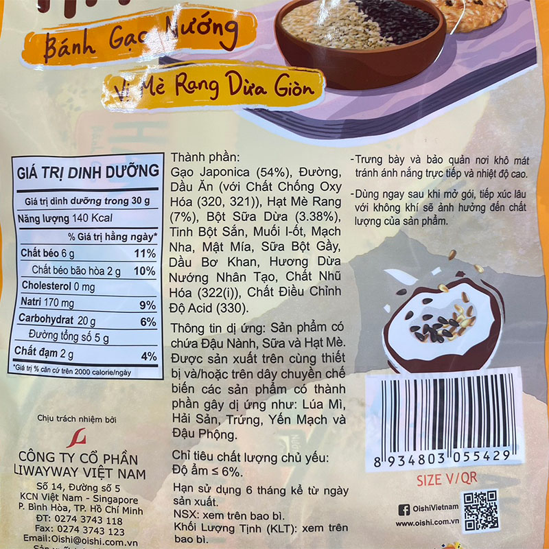 - Gạo Japonica (58%), Đường, Dầu Ăn (với Chất Chống Oxy Hóa (320, 321), Bột Mè Rang, Tinh Bột Khoai Mì, Muối l-ốt, Bột Kem Không Sữa, Mật Mía, Maltodextrin, Mach Nha, Sữa Bột Gay, Dầu Bơ Khan, Hương Dừa Nướng Nhân Tạo , Chất Nhũ Hóa (322(i)), Chất Điều Chỉnh Độ Acid (330)