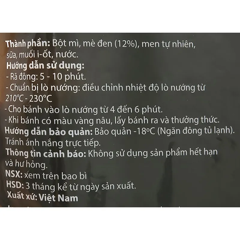 - Bột mì, men tự nhiên, sữa, muối i-ốt, nước, mè đen.