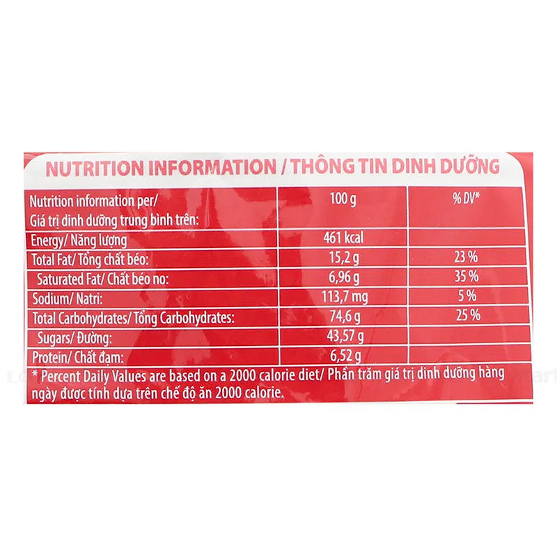 Thành phần: Bột mì, đường, dầu thực vật (dầu cọ), bột bắp, hương liệu tổng hợp (vani, dâu). Hướng dẫn sử dụng: Dùng ăn liền. Bảo quản: Nơi khô ráo, thoáng mát, tránh ánh nắng trực tiếp. Hạn sử dụng: 12 tháng kể từ ngày sản xuất. Nơi sản xuất: Việt Nam.
