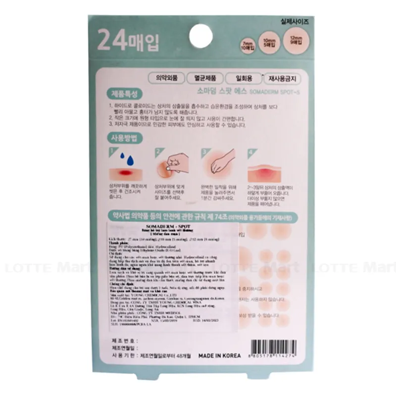 - Miếng Dán Mụn Somaderm Spot 24 3 Size 24 Miếng chứa Hydrocolloid có công dụng hấp thu dịch mô và duy trì độ ẩm trên vết mụn, hỗ trợ nhanh làm lành da, ngăn ngừa khả năng hình thành vết thâm, vết sẹo.