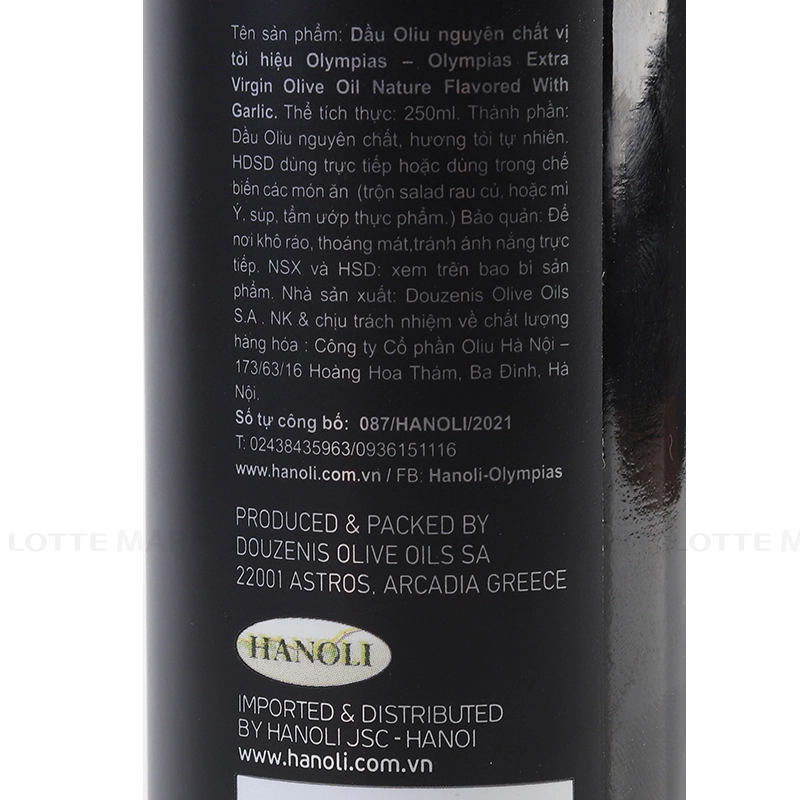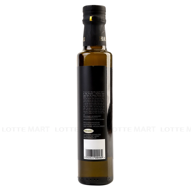 - Dầu Oliu Olympias Vị Tỏi Chai 250ml được nhập khẩu nguyên chai từ quả oliu Koroneiki vùng Messinia Hy Lạp – vùng trồng oliu số 1 Hy Lạp và thế giới. Sử dụng công nghệ ép lạnh nên giữ nguyên các hợp chất Omega 3-9, giảm Cholesterol trong máu, ngăn ngừa các bệnh tim mạch, tiểu đường, huyết áp.