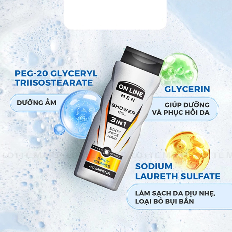 - Dầu Tắm Gội Nam 3 trong 1 On Line Spicy Orange với công thức đột phá giúp chăm sóc hiệu quả đồng thời da mặt, tóc và cơ thể dành riêng cho nam giới. Sản phẩm giúp làm sạch nhẹ nhàng, phù hợp với mọi loại da kể cả làn da nhạy cảm, đem lại cảm giác sảng khoái tươi mới và hương thơm mạnh mẽ đầy lôi cuốn.