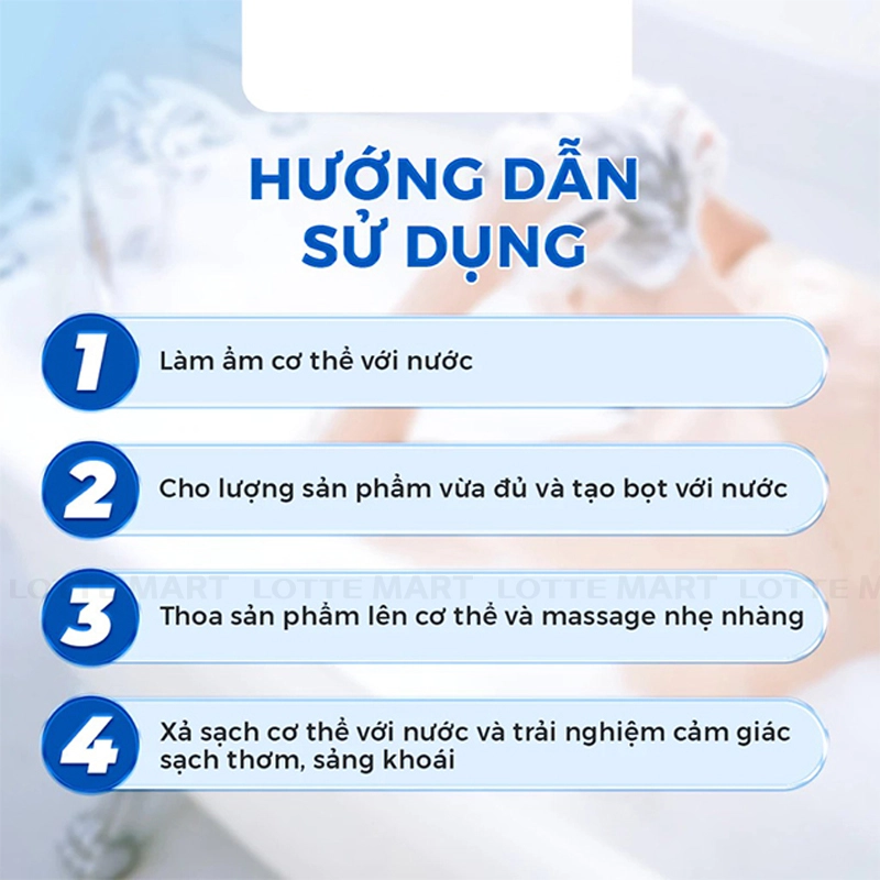 Hướng dẫn sử dụng: Thoa một lượng nhỏ sản phẩm lên tóc ẩm, mặt và cơ thể rồi massage cho đến khi bọt được hình thành. Sau đó tắm lại với nước sạch.