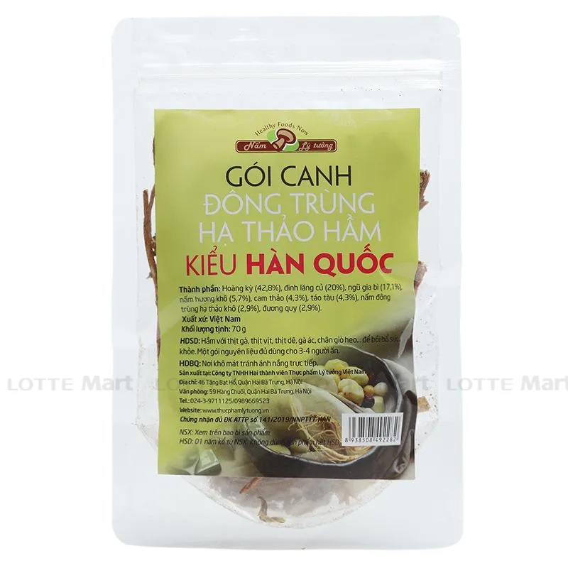 Gói canh nấm đông trùng hạ thảo kiểu Hàn Quốc 70g bao gồm các thành phần nấm, hạt và thảo quả dùng để hầm các loại canh như gà, vịt, dê, chân giò heo để bồi bổ sức khỏe hoặc chỉ đơn giản để các mẹ các chị dùng thanh nhã, đổi món. Thành phần, lượng các loại nấm, hạt, thảo quả được lựa chọn theo một bí quyết riêng và đặc biệt là thành phần nấm đông trùng hạ thảo cao cấp, bổ dưỡng.