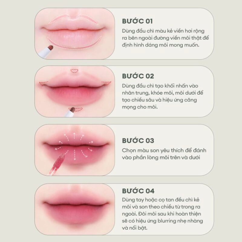 - Bước 04: Sử dụng ngón tay hoặc một cọ son để tán đều chì kẻ viền và son môi, theo chiều từ trong ra ngoài. Điều này giúp màu sắc hòa quyện một cách tự nhiên, tạo ra hiệu ứng mờ nhẹ, nổi bật cho đôi môi.
