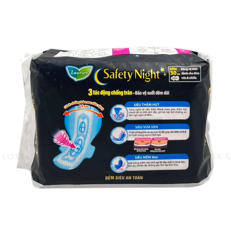 Băng Vệ Sinh Ban Đêm Laurier Siêu Chống Tràn 30cm Gói 4 Miếng sử dụng công nghệ lõi siêu thấm nhanh Block Core Nhật Bản thấm hút nhanh kể cả chất dịch đặc và nhiều hơn 1,4 lần (so với loại dày cánh ban ngày). Bề mặt luôn khô thoáng cùng vách chống tràn siêu an toàn cho bạn trọn giấc ngủ ngon không lo lắng.