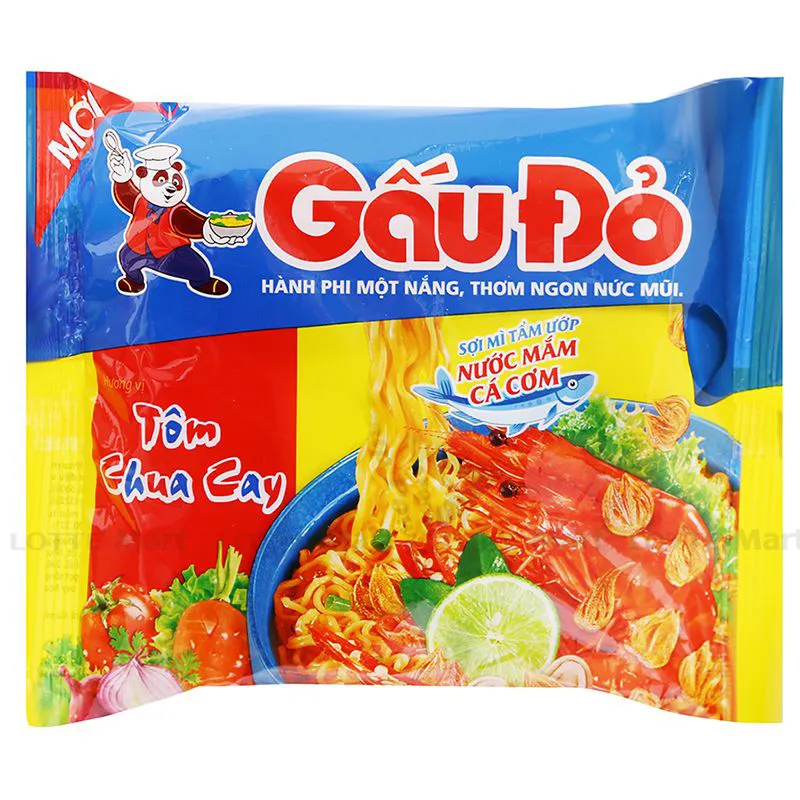 Mì Gấu Đỏ Tôm Chua Cay có sợi mì vàng, dai, béo. Với tinh chất khoai tây có trong mì, sản phẩm sẽ cung cấp thêm cho người dùng nhiều chất dinh dưỡng và không gây nóng cho cơ thể. Hương vị tôm chua cay cho nước súp chua chua, cay cay kích thích vị giác hòa quyện với rau sấy, tạo nên một loại mì vô cùng đặc biệt và hấp dẫn.