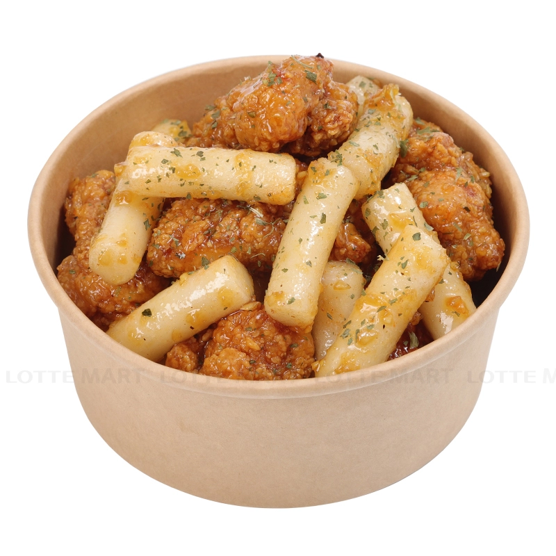 Thành phần: Bánh gạo chiên, gà Dakgangjeong, mè rang, sốt tương tỏi, lá thơm mùi tây.