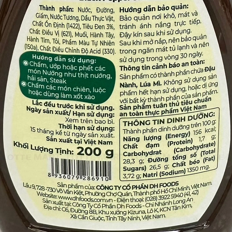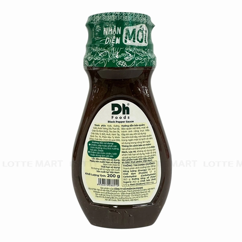 Sốt Tiêu Đen Dh Foods Chai 200g nổi bật với chất sốt sánh mịn, dễ ngấm vào thức ăn. Sự kết hợp của Tiêu đen nguyên chất và các thành phần khác tạo ra vị sốt có hương thơm nồng nàn, cay the đậm đà, hoàn hảo giúp món ăn thêm hấp dẫn và kích thích vị giác.