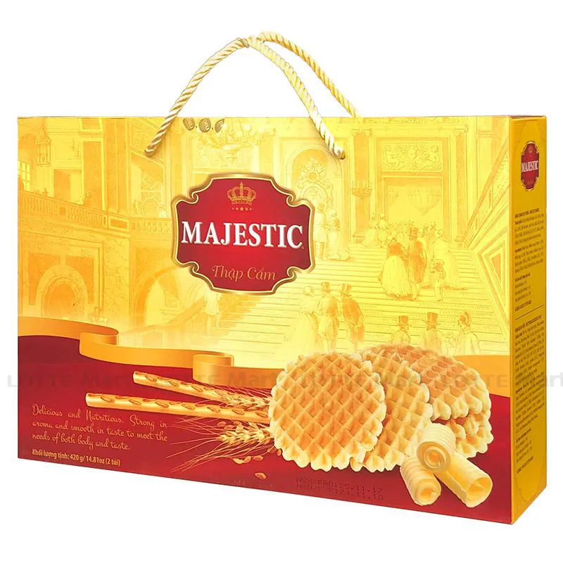 Hộp bánh được thiết kế khác biệt với 2 quai xách đính trên đầu, cho phép bạn dễ dàng xách và mang theo, hoặc là món quà vô cùng trang trọng và lịch sự để biếu/tặng người thân, bạn bè trong dịp đặc biệt như lễ tết… Nguồn nguyên liệu chọn lọc và đảm bảo chất lượng, cung cấp dinh dưỡng cần thiết – Bánh Majestic quai xách là món ăn nhẹ, ăn chơi cực lý tưởng cho nhiều lứa tuổi.