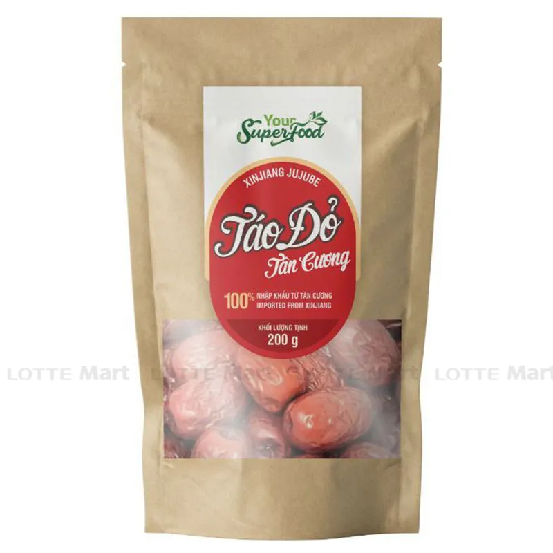 Giúp giảm đau cơ, làm giảm cảm giác thèm ăn, hỗ trợ tim mạch, tăng cường trao đổi chất, làm sạch các mạch máu, ức chế các tế bào ung thư, giúp cải thiện táo bón như một thành phần nhuận tràng, giảm lo âu, giúp xây dựng cơ bắp, hỗ trợ tiểu đường, tạo cảm giác hưng phấn, cải thiên chứng rối loạn chức năngTáo Đỏ Tân Cương Your Super Food được trồng tại vùng cao nguyên Tân Cương, nơi nhiệt độ chênh lệch giữa ngày và đêm lên tới hơn 30 độ C. Táo đỏ được giữ khô tự nhiên trên cành, hấp thụ tối đa dưỡng chất, có vị ngọt vừa phải, thịt táo xốp dẻo, mịn tan khi thưởng thức. Táo Đỏ là thức ăn bổ dưỡng dùng để hầm với Yến, nấu súp, gà tiềm… Táo Đỏ Tân Cương là loại Táo cao cấp, rất thơm ngon khi nấu và ăn trực tiếp.Hướng dẫn sử dụng: Ăn trực tiếp hoặc làm nguyên liệu cho các món ăn.
