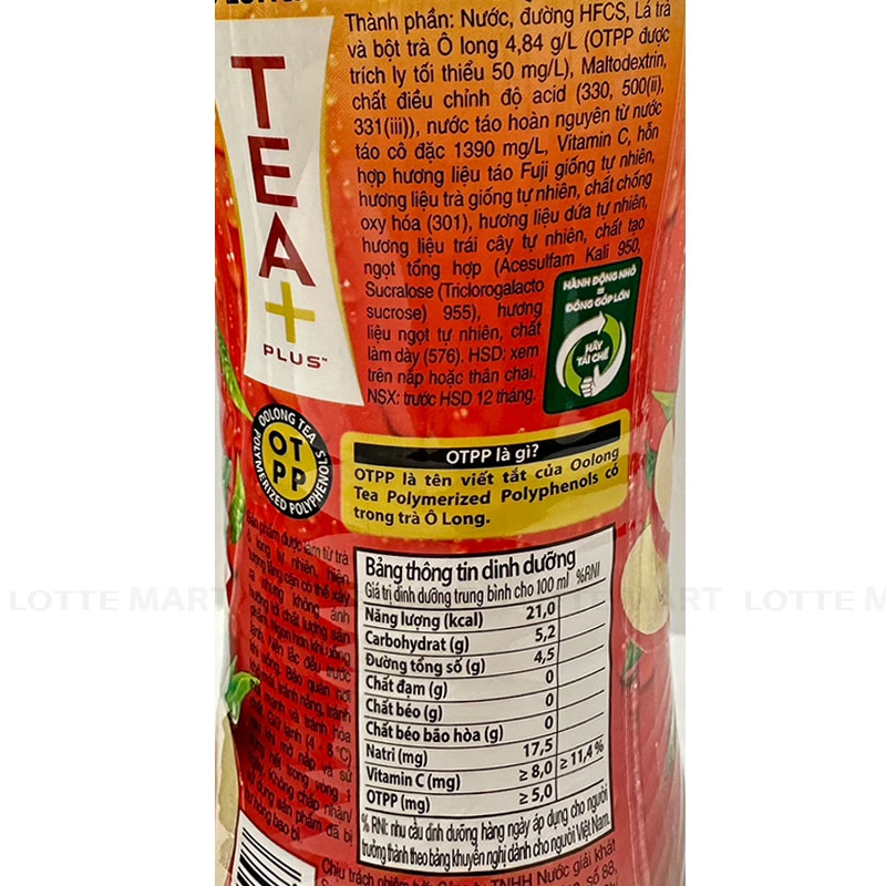 - Nước, đường HFCS, Lá trà và bột trà Ô long 4,84 g/L (OTPP được trích ly tối thiểu 50 mg/L), Maltodextrin, chất điều chỉnh độ acid (330, 500(ii), 331 (iii)), nước táo hoàn nguyên từ nước táo cô đặc 1390 mg/L, Vitamin C, hỗn hợp hương liệu táo Fuji giống tự nhiên, hương liệu trà giống tự nhiên, chất chống oxy hóa (301), hương liệu dứa tự nhiên, hương liệu trái cây tự nhiên, chất tạo ngọt tổng hợp (Acesulfam kali 950, Sucralose (Triclorogalacto sucrose) 955), hương liệu ngọt tự nhiên, chất làm dày (576).